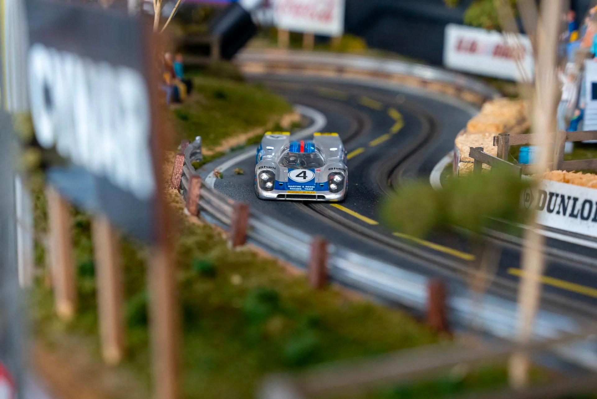 This is a one-of-a-kind custom slot car track built using a full-sized Porsche 917 replica that conceals a 1:32-scale working wooden slot car track faithful to the iconic Le Mans raceway.