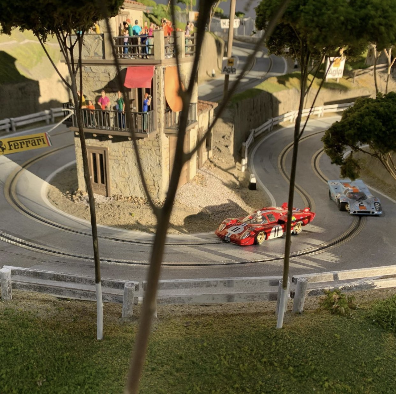 This is a one-of-a-kind custom slot car track built using a full-sized Porsche 917 replica that conceals a 1:32-scale working wooden slot car track faithful to the iconic Le Mans raceway.